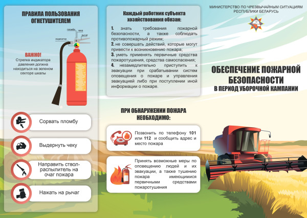 Особое внимание работникам хозяйств следует уделить исправности, а также укомплектованию техники, зерносушилок и зерноскладов первичными средствами пожаротушения. Все лица, задействованные в уборке урожая, должны знать и соблюдать правила безопасности, а также владеть навыками действий в случае возникновения пожара.